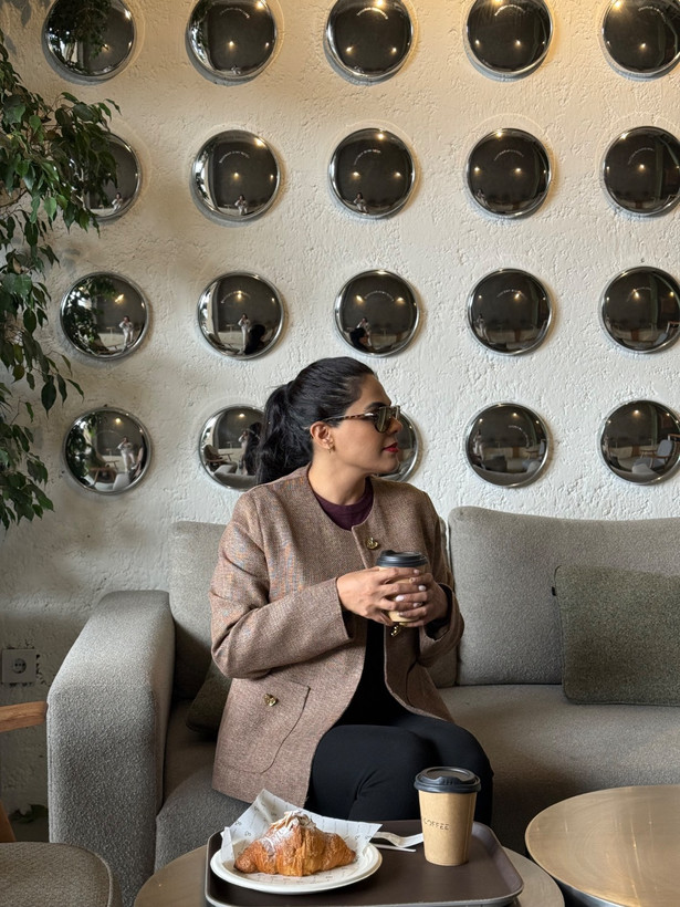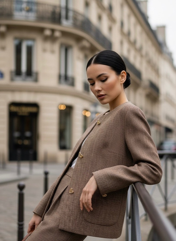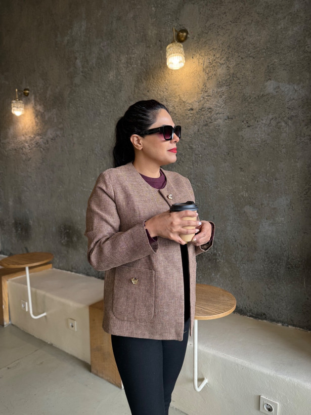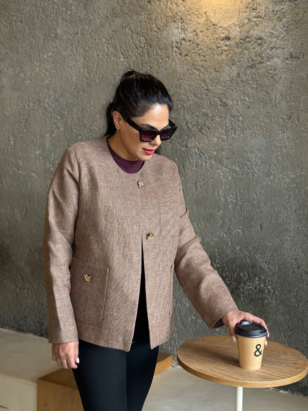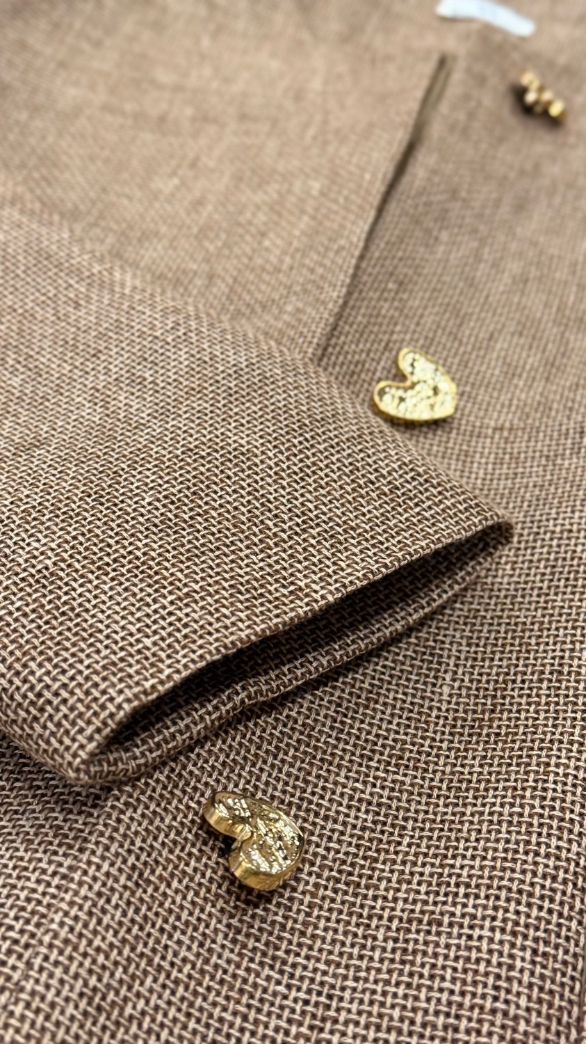 کت کنفی گونی بافت نسکافه ای رنگ فری سایز بهمراه دکمه نما قلبی شکل در جلو کت مناسب بار و تابستان قد کت 65 سانتی متر