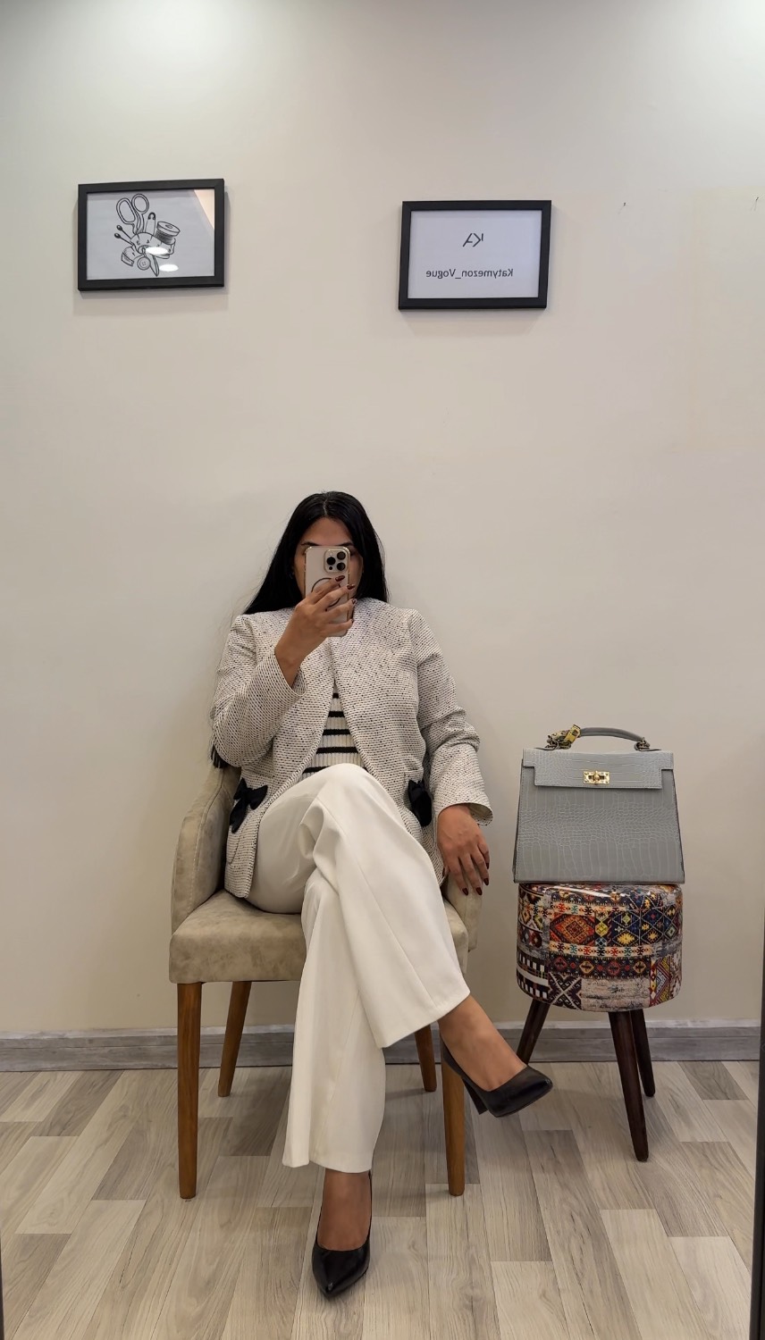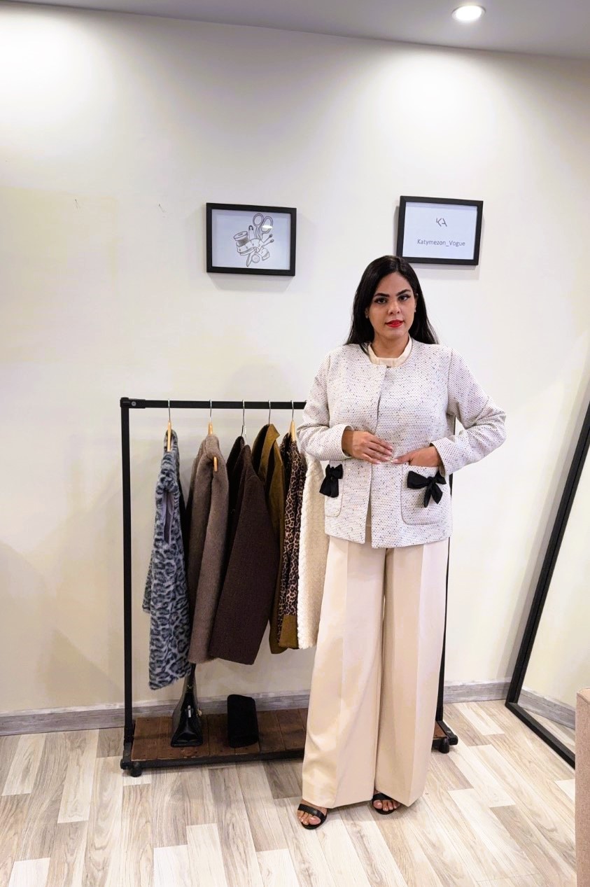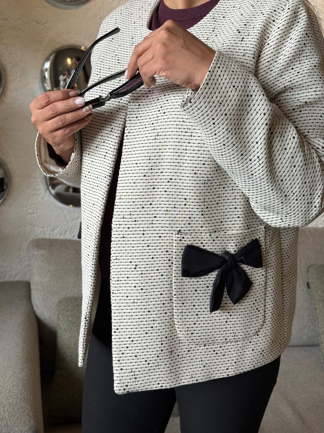 کت روشنا یقه گرد استخوانی با پولک ریز مشکی در بافت پارچه و دو جیب در جلو کت مزون دوزی